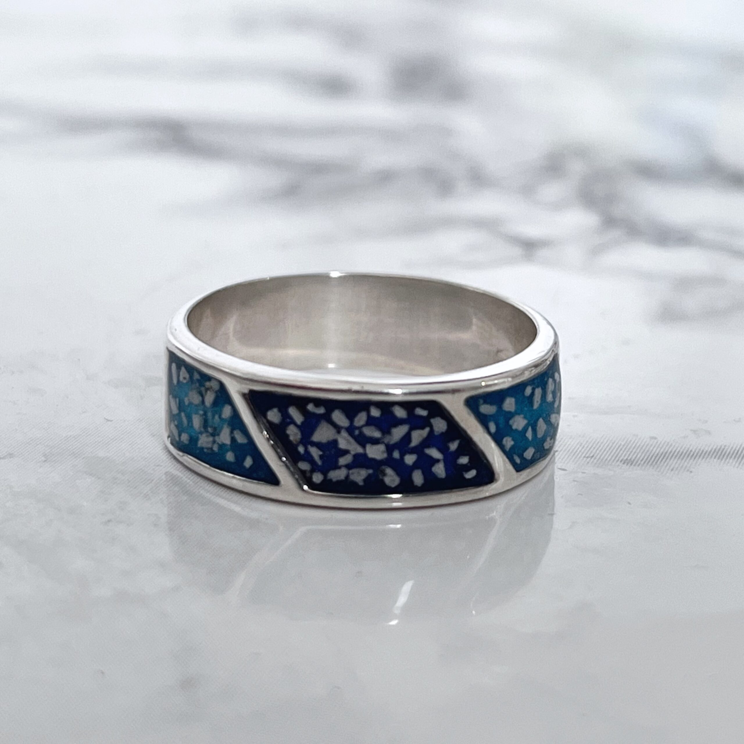 This stylish and contemporary sterling silver band ring has three separate compartments to use one or multiple collections.