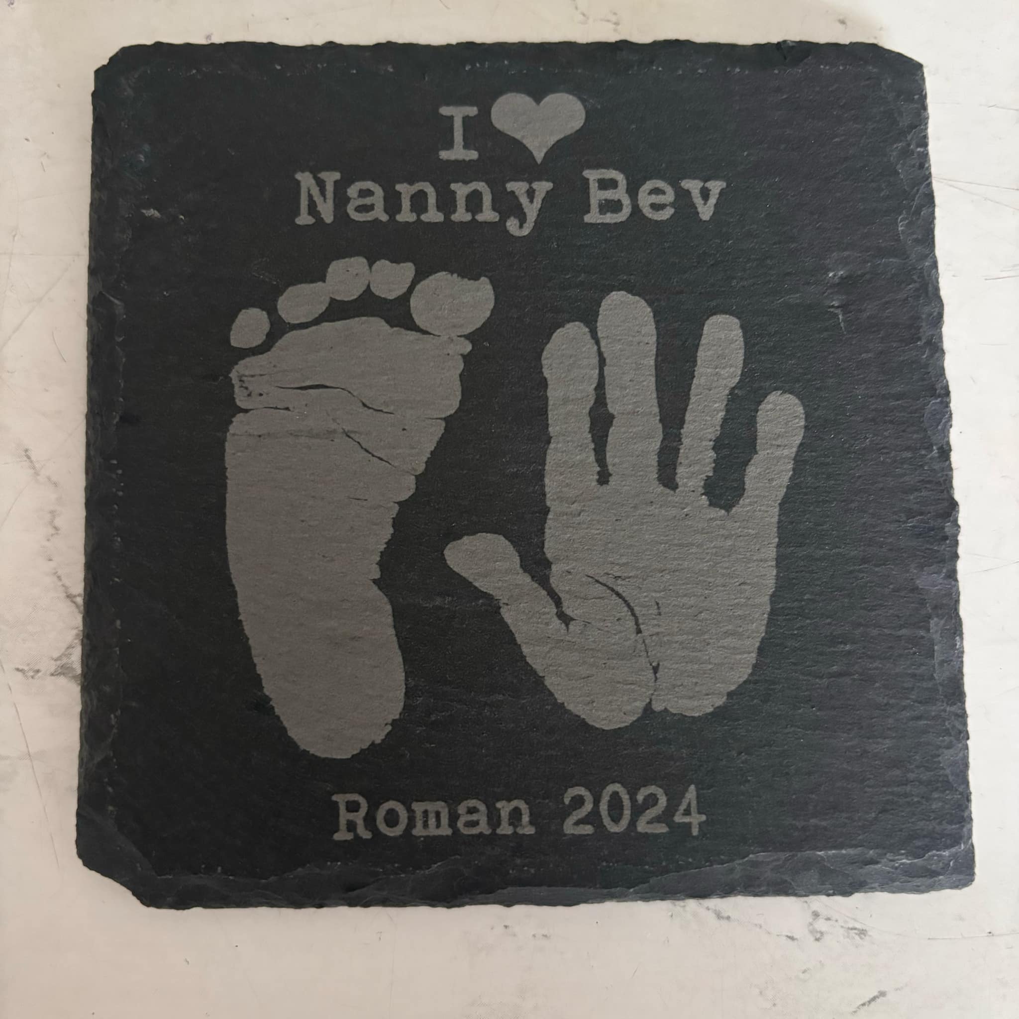 Slate square coaster, laser etched with your little ones prints and text of your choice.